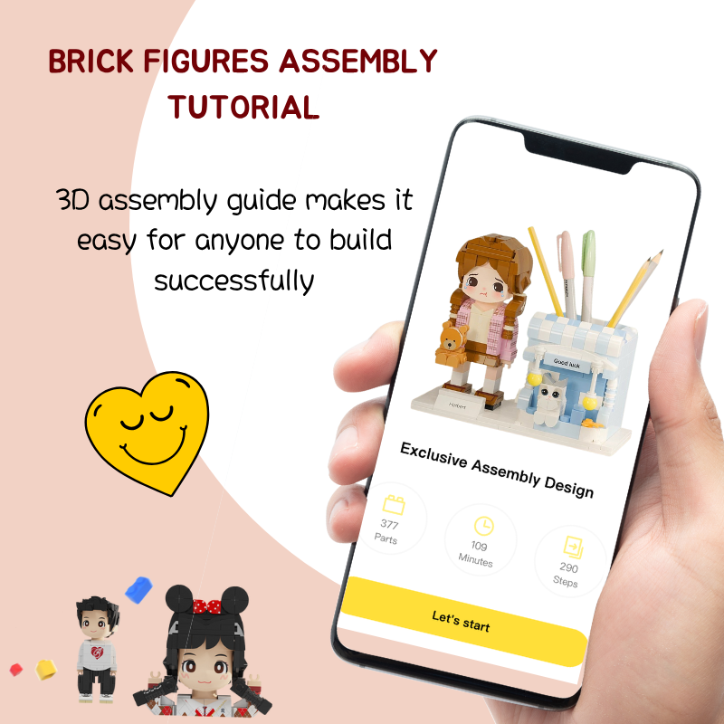 ✔️ A personalized instruction card — with your figurine’s image and a QR code to access step-by-step 3D building guide